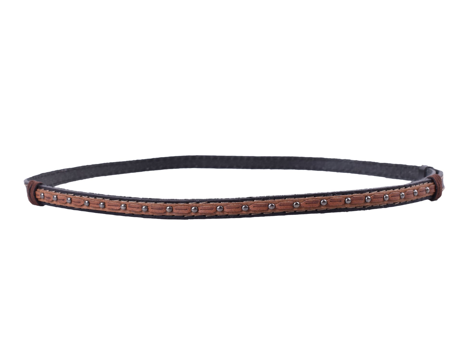 This rugged yet refined hatband features a medium brown embossed leather strip overlaid on a dark backing for contrast. The design is accented with a row of evenly spaced antique brass studs, adding a bold, western-inspired flair. Crafted for durability and style, it includes an adjustable leather tie for a secure fit on a wide range of hat sizes. A perfect accessory to elevate any cowboy or ranch hat.